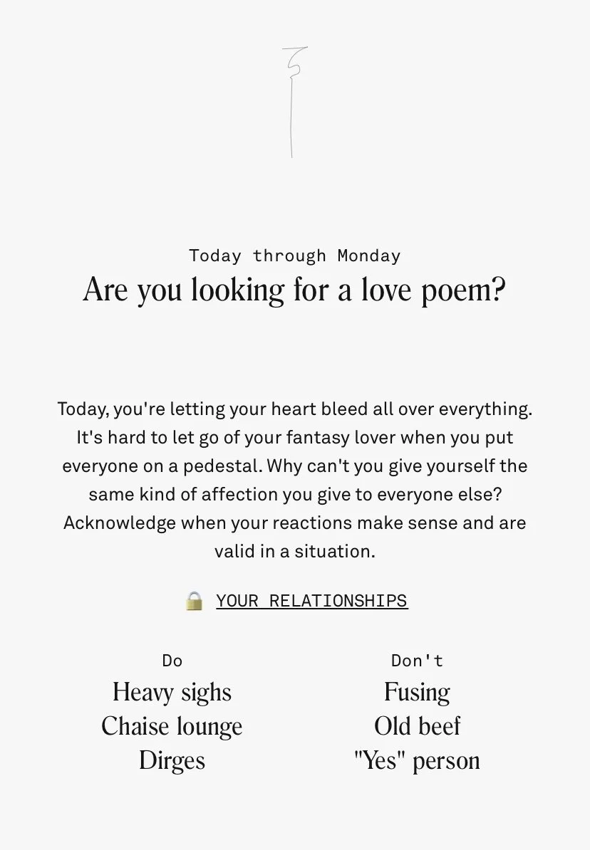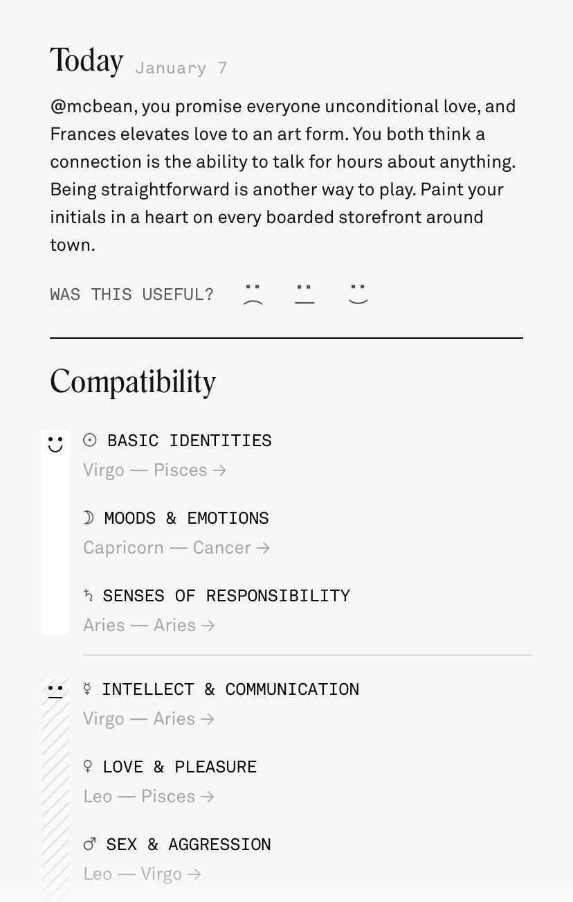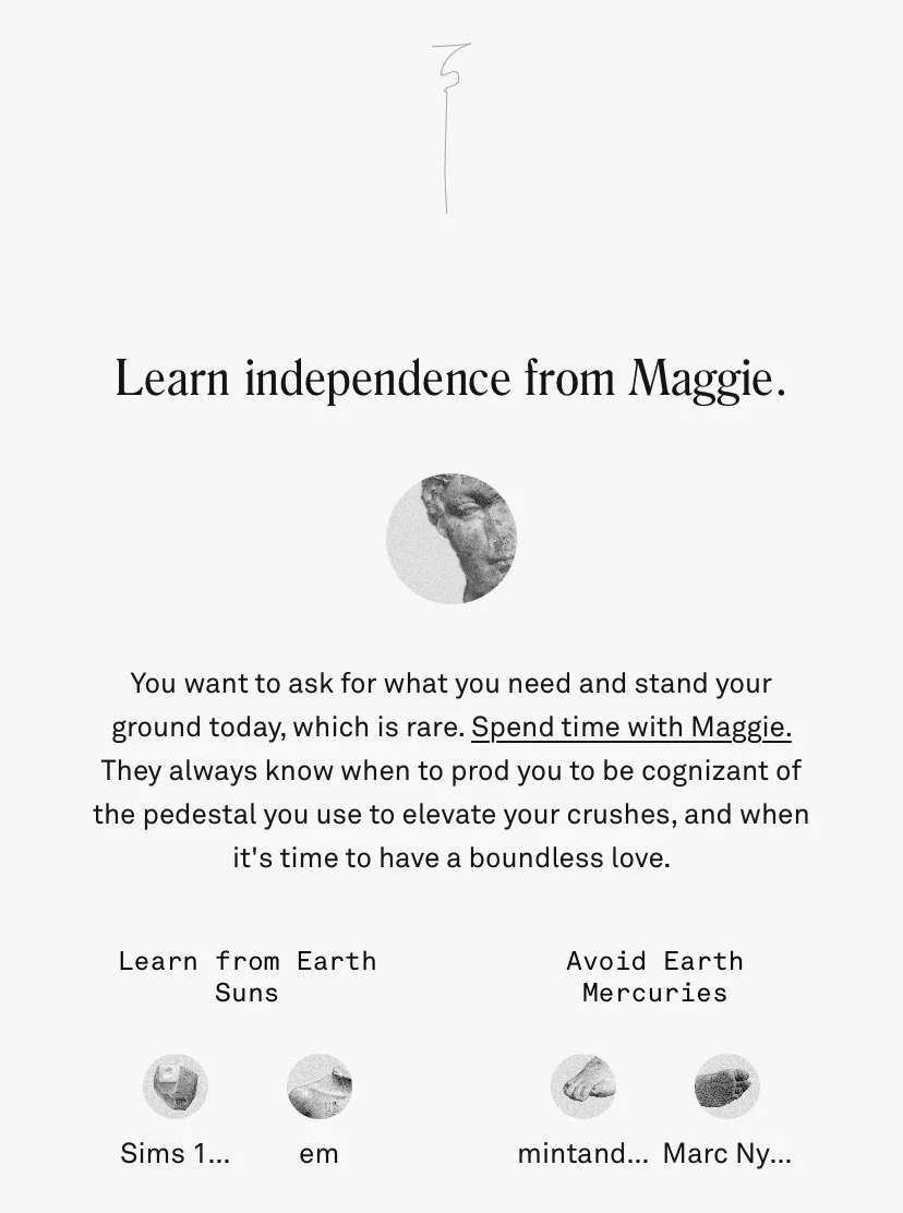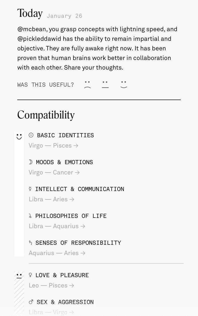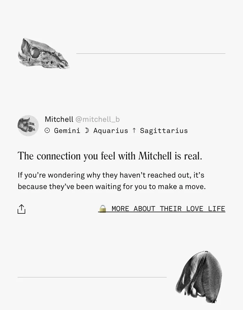 I used my knowledge of trends and memetics to write resonant in-app content. I also played a critical role in developing a content system of dynamic variables, making it possible to generate millions of hyper-personalized horoscopes with only hundreds of content pieces.
